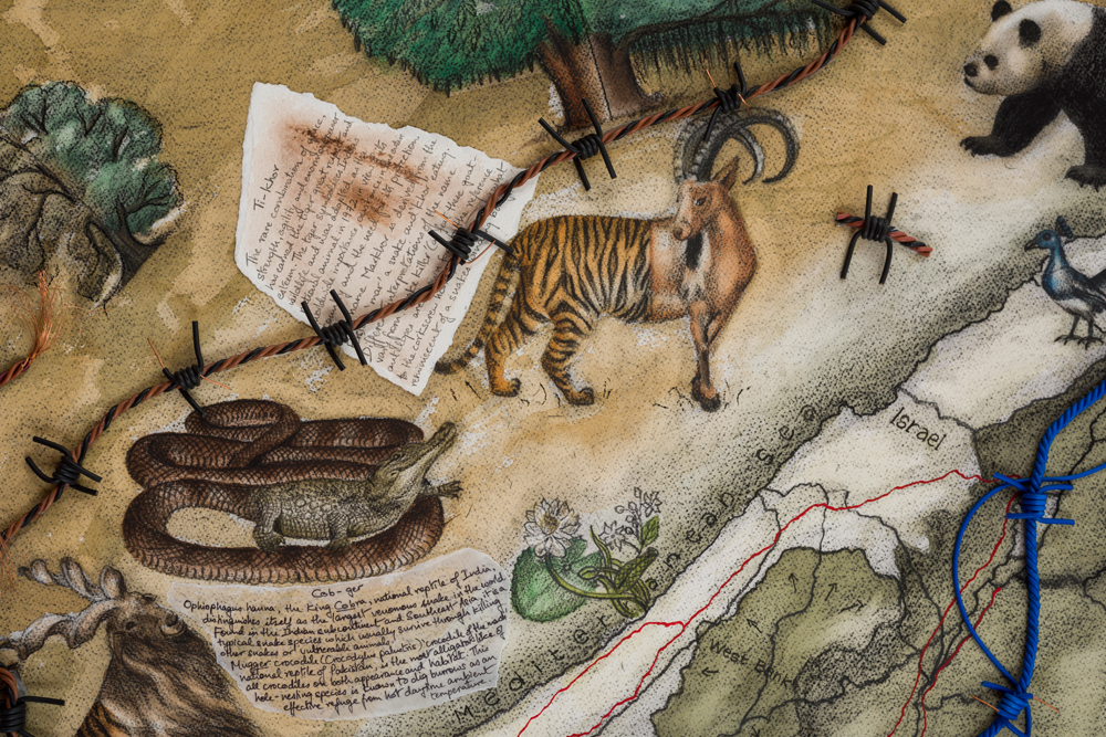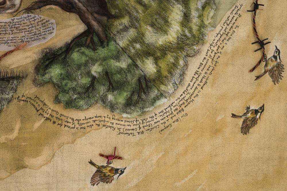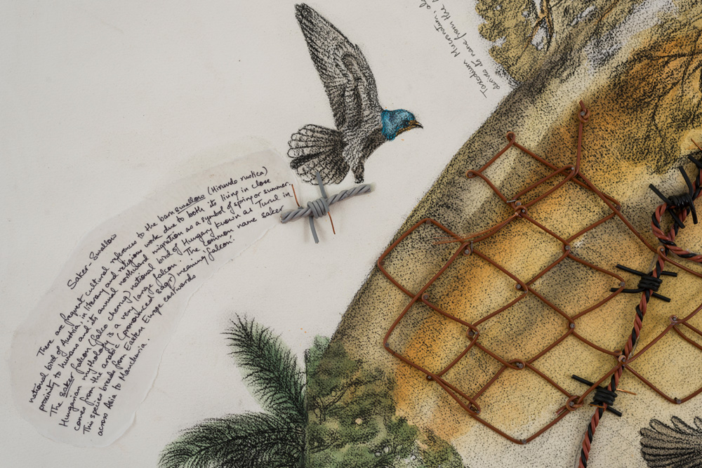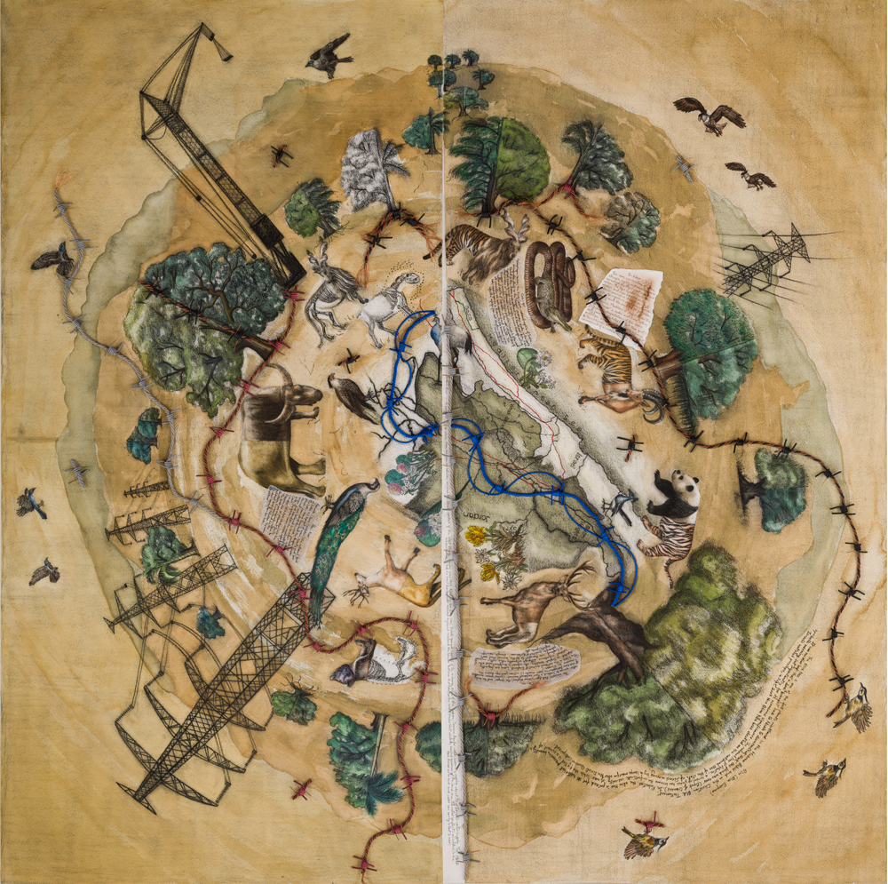 Cleft follows Hyphenated Lives, a series of works by Reena Kallat that imagine hybrid flora and fauna by merging the national animals and plants of hostile neighbor states. In Cleft these creatures roam the earth and skies and gaze questioningly towards the viewer. The earth with its rivers and mountains is cleaved apart by the superimposition of barbed wires woven from electric cables, a recurring motif in the artist’s works. The wires embody the contradictions of our present by bringing together two opposing objects—one a conduit for global communications and a harbinger of shortening distances, and the other a ubiquitous sign for borders, barriers and suspicion.