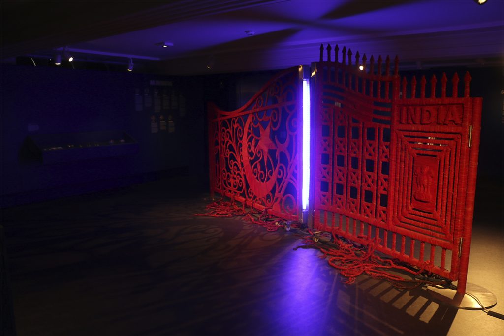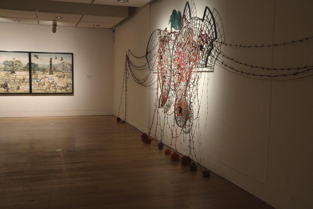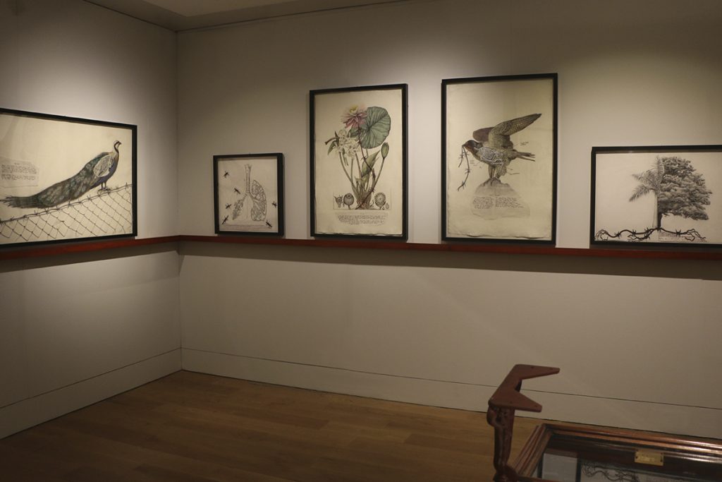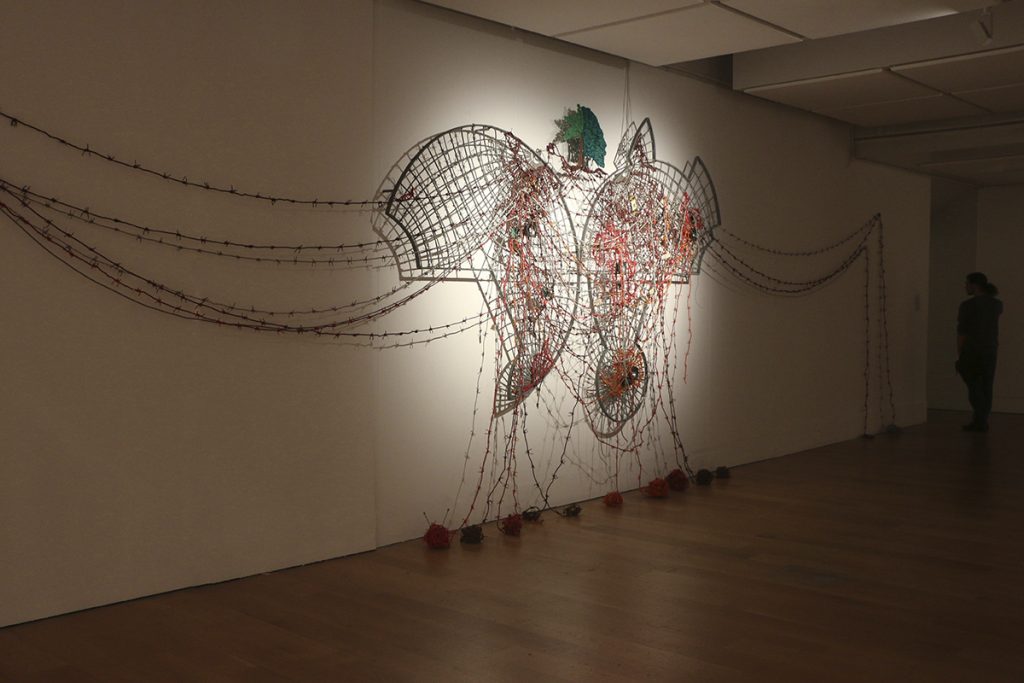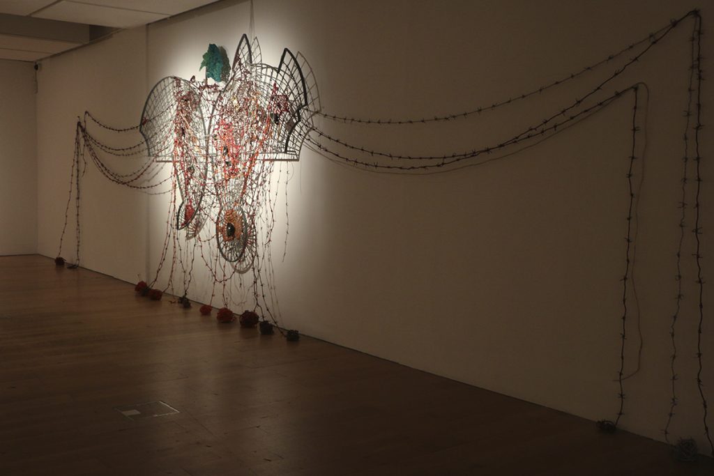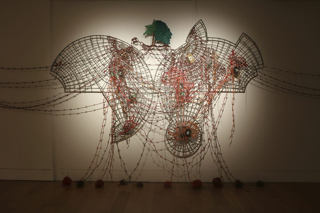 In the suite of works titled Hyphenated Lives that resemble zoological and botanical drawings, hybrid specimens of birds, animals, plants and trees formed by the merger of species appropriated as national emblems by various states symbolically unify the divided regions that form their habitat. These fantastical species come together in monumental drawings titled Cleft where they interrupt human geographies of conflict, replacing them with a mythic narrative of convergence. “I felt the need to turn to species other than the human race to tell us how to cohabit the planet, where the existence of one depends on the other or the disappearance of one species affects the other adversely. I often think of these conjoined forms as an allusion to nature’s defiance of artificially imposed, man-made divisions on the ground; a poetic provocation from the past or a proposition for an imagined future where indeed they may reunite”, the artist says. A recurring motif in Kallat’s works is the electrical cable, a symbol for the communication revolution and a conduit for energy and ideas that the artist has painstakingly woven into the shape of barbed wires. In Anatomy of a Distance, woven wires fitted with motion sensors take the shape of a disputed border. In Half Oxygen, wires have been woven into a frame like a large embroidery ring to create a pair of lungs, one half of which forms a banyan, India’s national tree and the other, the deodar, its Pakistani counterpart; creating a composite representing the shared soul of two warring nations. In these and other works that form this landmark mid-career survey, Reena Kallat urges us to reflect on borders, barriers, and the bonds that transcend them, on this planet that we all call home.