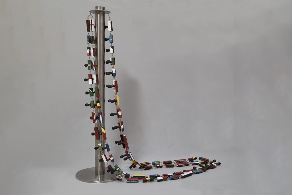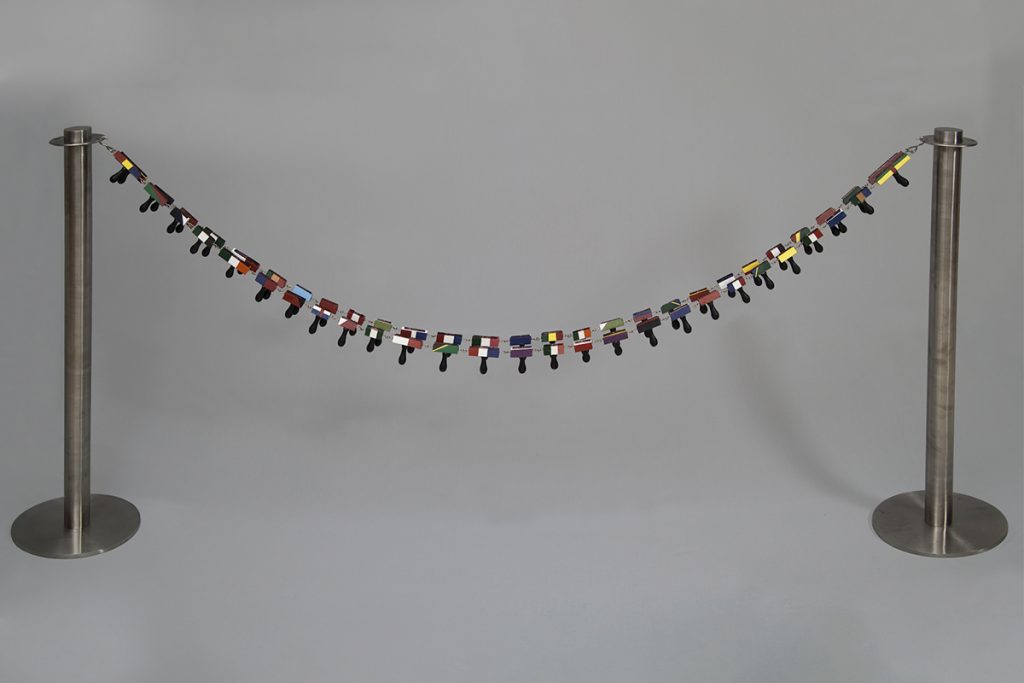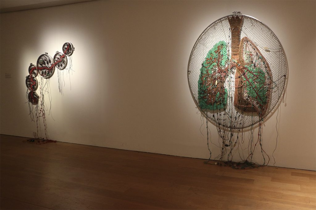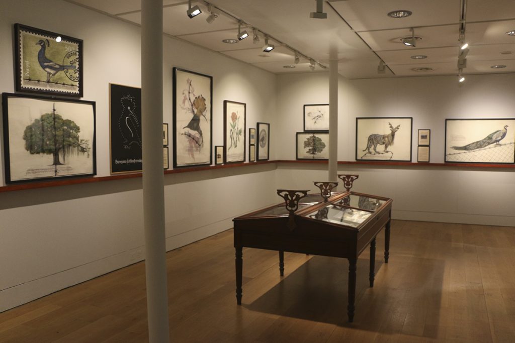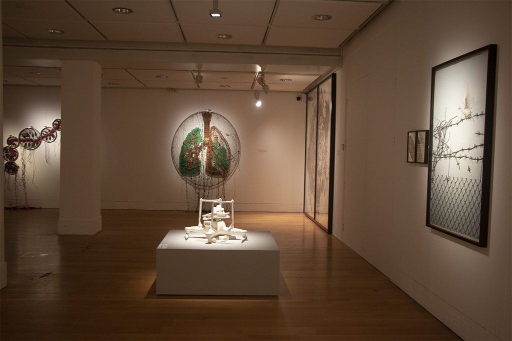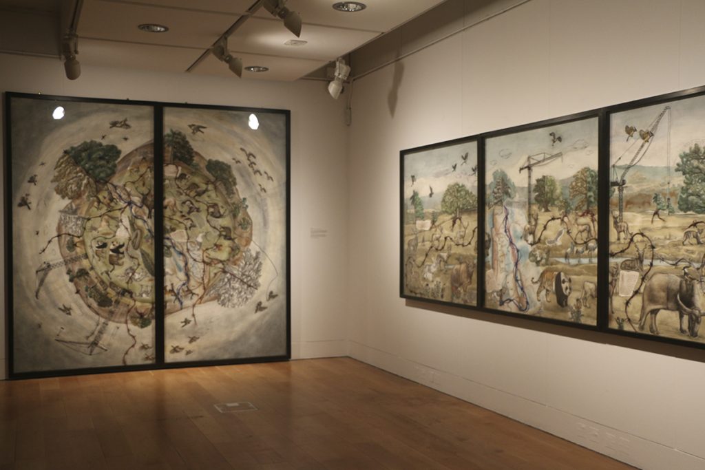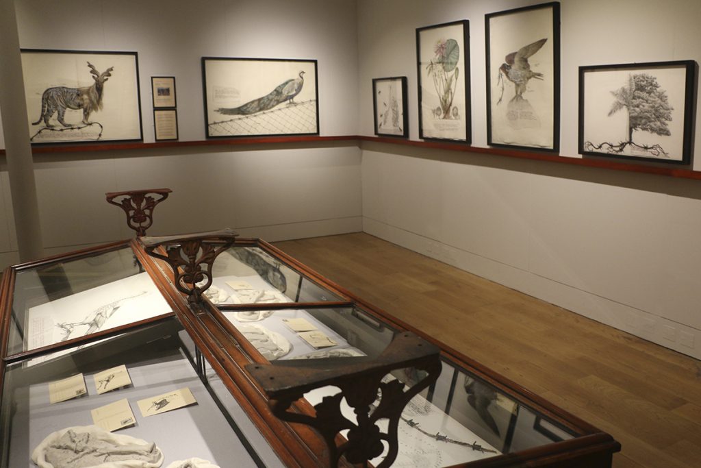 In the suite of works titled Hyphenated Lives that resemble zoological and botanical drawings, hybrid specimens of birds, animals, plants and trees formed by the merger of species appropriated as national emblems by various states symbolically unify the divided regions that form their habitat. These fantastical species come together in monumental drawings titled Cleft where they interrupt human geographies of conflict, replacing them with a mythic narrative of convergence. “I felt the need to turn to species other than the human race to tell us how to cohabit the planet, where the existence of one depends on the other or the disappearance of one species affects the other adversely. I often think of these conjoined forms as an allusion to nature’s defiance of artificially imposed, man-made divisions on the ground; a poetic provocation from the past or a proposition for an imagined future where indeed they may reunite”, the artist says. A recurring motif in Kallat’s works is the electrical cable, a symbol for the communication revolution and a conduit for energy and ideas that the artist has painstakingly woven into the shape of barbed wires. In Anatomy of a Distance, woven wires fitted with motion sensors take the shape of a disputed border. In Half Oxygen, wires have been woven into a frame like a large embroidery ring to create a pair of lungs, one half of which forms a banyan, India’s national tree and the other, the deodar, its Pakistani counterpart; creating a composite representing the shared soul of two warring nations. In these and other works that form this landmark mid-career survey, Reena Kallat urges us to reflect on borders, barriers, and the bonds that transcend them, on this planet that we all call home.