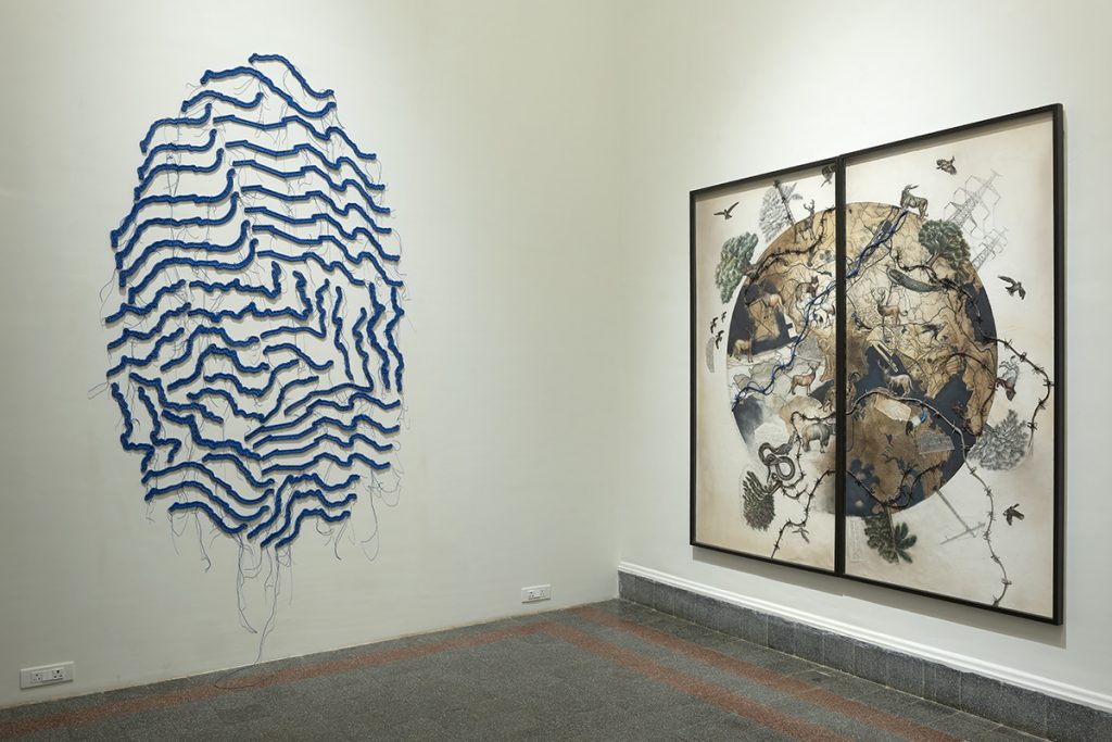 Kallat’s practice reflects a deep engagement with themes of injustice and human hubris, evident in the ways we interact and care for each other and the earth. She excavates troubled histories, often represented through motifs such as barbed wires and fractured identities, highlighting the lingering scars of colonialism. The arbitrary borders drawn by colonial powers in their former colonies – legacies of historic injustices – continue to fuel many of the conflicts plaguing the world today. Kallat deploys this as a powerful artistic trope to underscore her concerns and render prominent what becomes obscured by time and mediatic manipulation. The works have a particular resonance in the context of the Museum, which was an archetypal colonial institution historically engaged in controlling cultural narratives.