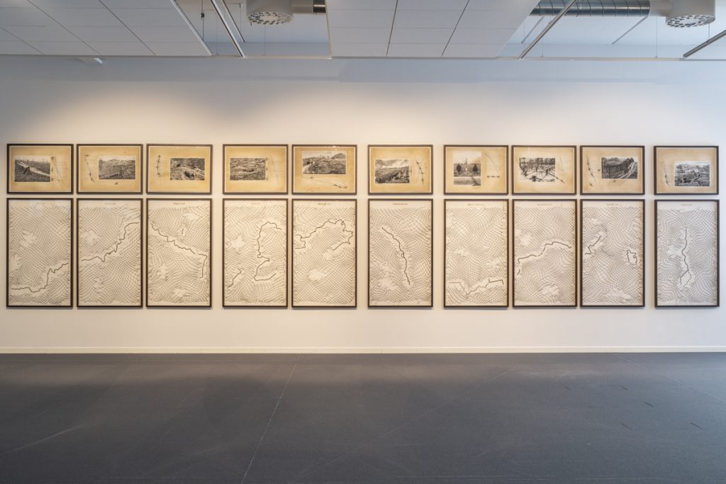 In the ten diptychs Leaking Lines, the artist intentionally conflates the ‘line’—a primary artistic tool—juxtaposing the outlines of borders from across the world with images of the landscapes they divide and apportion. Many are national borders while others such as Maginot line were war time fortifications which offered a false sense of security. Leaking Lines refers both to the violence and fragility of national borders.